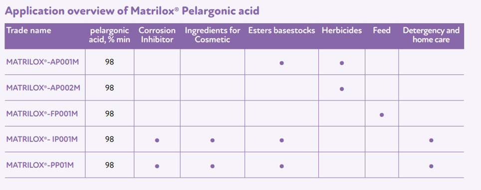Pelargonic acid (nonanoic acid) is a monocarboxylic acid. The Matrilox® product, 100% bio-based, is available in different purity grades depending on the application.